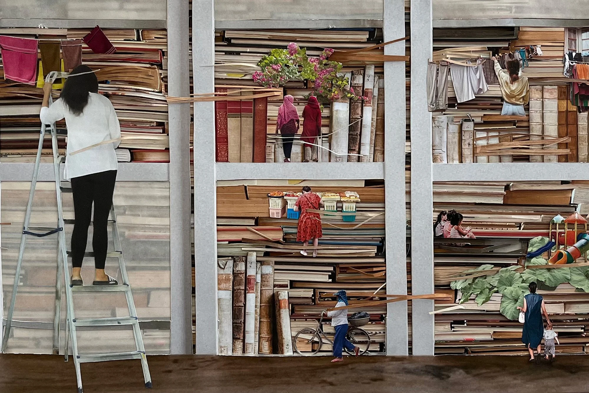 At the centre of the artwork stands a large glass cabinet filled with books, symbolising the current architecture of law. Some compartments remain fully intact, representing the aspects of the legal system that continue to operate as originally designed. In other areas, however, the glass has disappeared and the books themselves have begun to unravel, their pages shredded and spilling outward. These ruptures do not indicate the collapse of the system; instead, they signal an ongoing process of revision. By allowing the books to fray, the collage reflects Prof Vijeyarasa’s call for rewriting—not discarding—the rules. The exposed and reworked volumes reflect the labour required to craft legislation attentive to women’s lived realities.